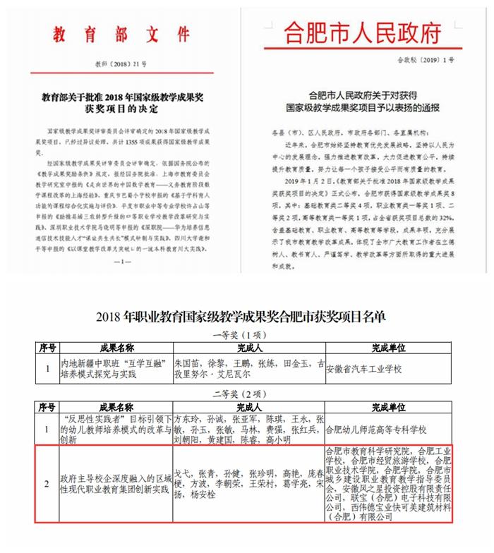 通過加強培訓,建立聯系,中心架設起校、企溝通交流的橋梁,成為校企合作的紐帶,產教融合的推動力量。在2018年中等職業教育教學成果獎評選中,中心與合肥市教育科學研究院、合肥工業學校、西偉德寶業快可美(合肥)建筑材料有限公司等單位緊密合作,聯合申報的《政府主導校企深度融入區域性現代職業教育集團創新實踐》項目獲安徽省特等獎、國家二等獎,還有多個聯合申報的項目獲得省級二等獎等獎項。下一步,中心還將致力于合肥市現代職業教育集團產學研聯盟的建設,進一步密切集團內各類學校、企業、行業協會的聯系,深入開展技術和產品研發、課程標準和人才培養方案制定、技能培訓、成果轉移轉化、技術服務等方面的服務,在生產、育人、研究等方面取得跟多的成果。