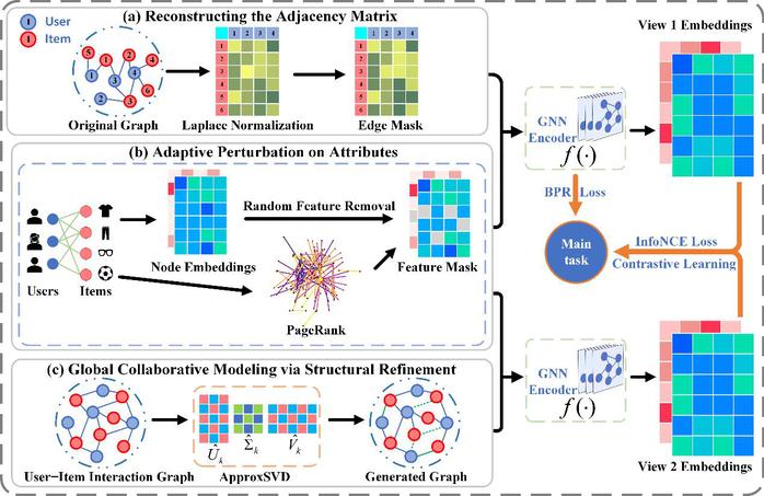 圖增強(qiáng)策略優(yōu)化圖對(duì)比學(xué)習(xí)的推薦系統(tǒng)結(jié)構(gòu)圖