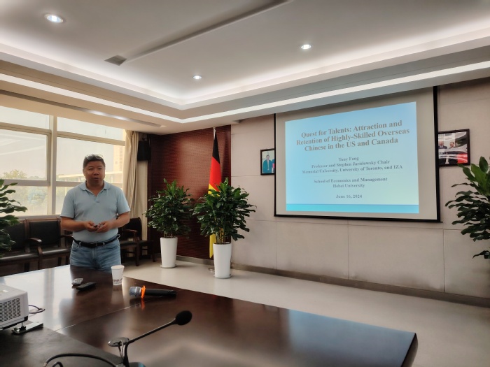 方濤教授以“Attraction and retention of highly skilled overseas Chinese in the United States and Canada”(《美國和加拿大對海外華人高端人才的吸引與留用研究》)為題給經(jīng)濟與管理學(xué)院師生做了一場精彩的學(xué)術(shù)報告。他結(jié)合豐富的研究數(shù)據(jù)與案例,深入剖析美加兩國吸引和留住海外華人高技能人才的策略。報告結(jié)束后,方濤與經(jīng)濟與管理學(xué)院師生、德籍教授湯衛(wèi)思進行座談,就國際人才流動趨勢、區(qū)域經(jīng)濟發(fā)展與人才政策等議題展開討論,碰撞出諸多思想火花。