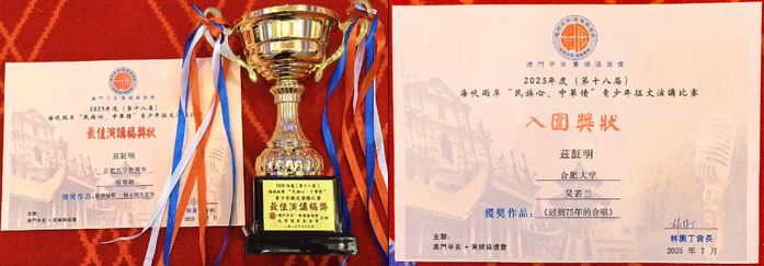 近日,由澳門辛亥?黃埔協進會主辦的第十八屆海峽兩岸“民族心、中華情”青少年征文演講比賽在澳門舉行。我校語言文化與傳媒學院徐萌萌和吳若蘭代表安徽省大學生參加比賽,徐萌萌榮獲“最佳演講稿獎”,吳若蘭榮獲“英才獎”。