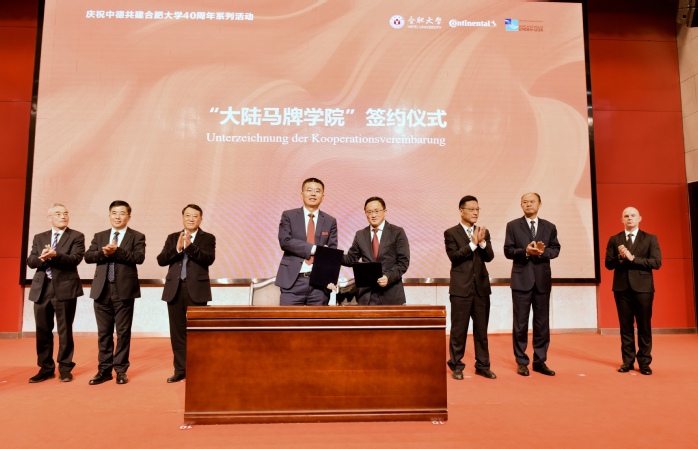 2025年正值中德共建合肥大學(xué)四十周年,也是合肥大學(xué)雙元制高等教育“大陸班”項(xiàng)目步入第十年的重要節(jié)點(diǎn)。10月22日,中德共建合肥大學(xué)40周年暨“大陸班”建設(shè)10周年慶祝活動(dòng)在合肥大學(xué)舉辦。合肥市委副書記、市長(zhǎng)羅云峰,安徽省教育廳一級(jí)巡視員張昌華,安徽省人民政府外事辦公室黨組成員、副主任王年寶,合肥市政協(xié)副主席、市政府秘書長(zhǎng)羅平,大陸馬牌輪胎(中國(guó))有限公司工廠總經(jīng)理王小驥,合肥大學(xué)全體校領(lǐng)導(dǎo)等出席活動(dòng),共同見證大陸馬牌學(xué)院簽約,并為“大陸馬牌學(xué)院”揭牌。