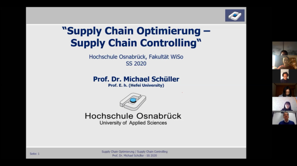 3月9日星期一,德國時間早上7點50分,中國時間下午14點50分,經(jīng)濟與管理學(xué)院的同學(xué)們在各自家中的書桌前,滿懷期待地點開了軟件Zoom,陸續(xù)登陸進入由中方助課教師注冊主持的遠程直播教室,做好聽課準備。此時,在距離中國合肥一萬多公里外的德國奧斯納布呂克應(yīng)用科學(xué)大學(xué),物流管理(中外合作)德方項目負責(zé)人舒勒教授也進入直播教室,完成課件共享和課程直播的最后調(diào)試工作。德國時間早上8點整,中國時間下午15點整,2017級物流管理(中外合作)2020年春季學(xué)期準時在“云端”開課。