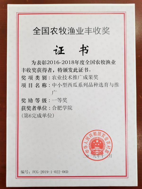 近期,農(nóng)業(yè)農(nóng)村部發(fā)布《關(guān)于2016-2018年度全國農(nóng)牧漁業(yè)豐收獎獲獎情況的通報》(農(nóng)科教發(fā)〔2019〕4號),表彰獎勵在農(nóng)業(yè)技術(shù)推廣工作中做出貢獻的單位和個人。我校參與的“中小型西瓜系列品種選育與推廣”榮獲農(nóng)業(yè)技術(shù)推廣成果獎一等獎,這是我校首次獲得全國農(nóng)牧漁業(yè)豐收獎一等獎。