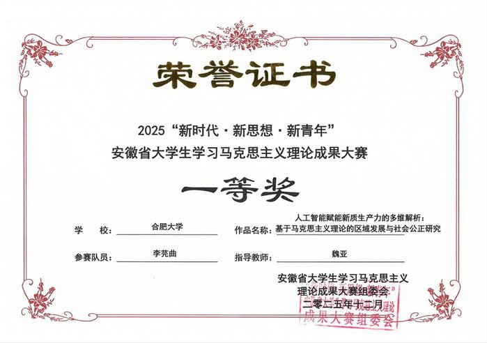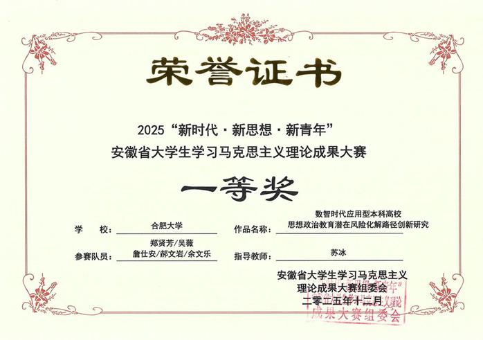 近日,2025年第七屆“新時代·新思想·新青年”安徽省大學生學習馬克思主義理論成果大賽獲獎名單正式公布。我校組織報送的5件作品全部獲獎,共獲得一等獎2項、二等獎2項、三等獎1項,2位教師獲評“優秀指導教師”,獲獎等級與數量均實現歷史性突破,充分展現了我校在馬克思主義理論教育、實踐育人與創新能力培養方面的顯著成效。