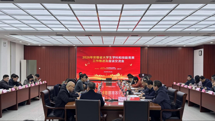 近日,由省教育廳高等教育處組織的2026年安徽省大學生學科和技能競賽工作推進及座談交流會在我校大學生活動中心會議室召開,專題解讀年度競賽整體安排、核心要求及重點任務。省教育廳高教處處長蔣正飛、安徽省大學生創新創業教育辦公室相關負責人及各賽事秘書長單位與承辦高校競賽負責人出席會議。