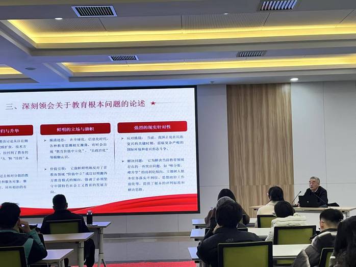 校黨委書記鄔平川以“深學細悟習近平總書記關于教育的重要論述 以教育家精神鑄魂強師”主題作培訓總結報告,激勵新教師深學細悟習近平總書記關于教育的重要論述,自覺踐行教育家精神。