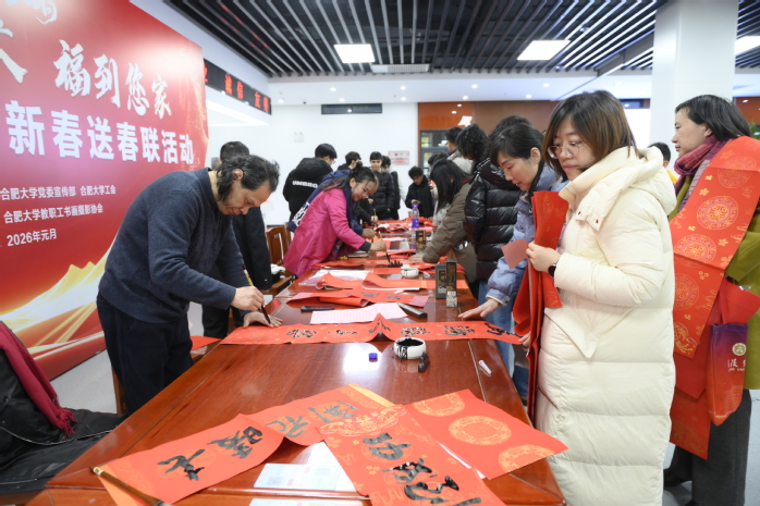 翰墨飄香添雅韻,春聯(lián)煥彩賀新春。1月30日,在農(nóng)歷丙午馬年新春佳節(jié)即將來臨之際,由黨委宣傳部、校工會主辦,教職工書畫攝影協(xié)會承辦,以“春滿合大?福到您家”為主題的迎新春送春聯(lián)活動在二期大學(xué)生活動中心舉行。校領(lǐng)導(dǎo)鄔平川、任永、周飛、白義香、吳功福、王曉峰親臨活動現(xiàn)場指導(dǎo)。