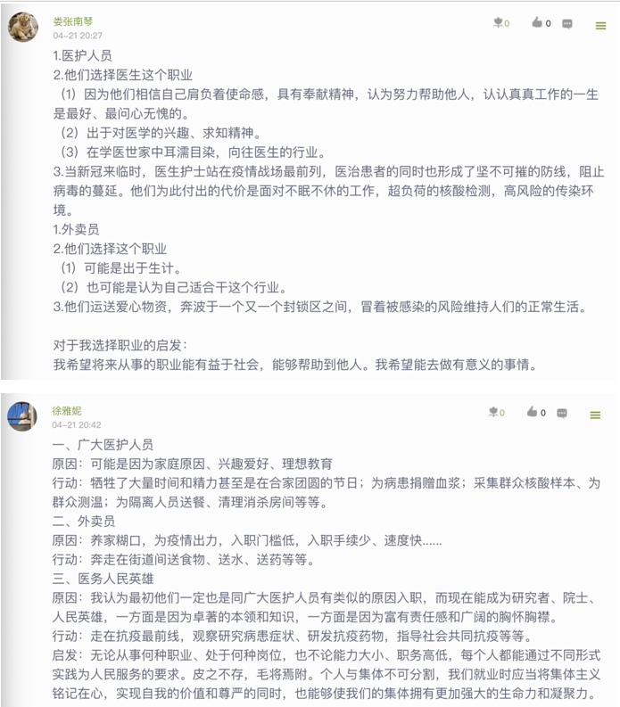 對于課程思政,外國語學院的李靜老師有著深刻的理解,“外語課程的思政教育是一個有深度有溫度的潛移默化的教育過程,應該結合課程特點和學生的認知特點,貫徹課程思政隱性滲透原則”。最近幾周,李老師發覺疫情讓不少學生產生了焦慮和煩躁心理,致使學習自律性下降。為緩解學生的焦躁情緒,讓更多學生在線上課堂“多抬頭”“多開口”,李老師在《高級英語》課的線上教學中組織了一次課堂討論:介紹一位你最敬佩的科學家。在討論中,大部分同學都提到了鐘南山和屠呦呦,李老師不僅擴充原有話題的內容與形式,還幫助同學了解防疫、抗疫的相關知識與政策。“這次討論活動不僅幫助學生尋找疫情中的正能量,培養科學觀和求真意識,還能激發學生樹立遠大理想,緩解焦躁情緒。”李老師說道。