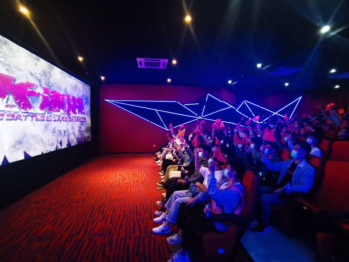 圖為機(jī)制學(xué)生黨支部成員與社區(qū)同學(xué)一起觀看紅色電影《長(zhǎng)津湖》