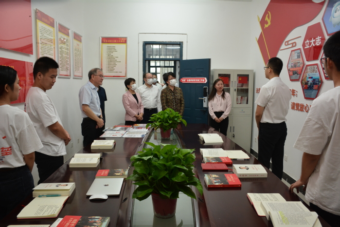 圖為翁鐵慧部長(zhǎng)在“啟航”全國(guó)樣板黨支部活動(dòng)室內(nèi)與師生親切交流