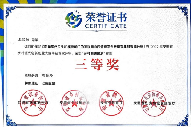 對于王漢陽來說,學習從來都不局限于課堂。他曾經參加過“挑戰杯”、“互聯網+”、大數據與人工智能應用競賽等大大小小的科研競賽,其中多次獲得了理想的成績。在安徽省大學生網絡與分布式系統創新設計大賽中,他與隊友們齊心協力,面對復雜的賽題,他們不畏懼、不退縮。經過連續多日的艱苦奮戰,不斷嘗試各種解決方案,最終成功突破重重難關,榮獲大數據應用賽道三等獎。這次經歷讓他深刻體會到團隊協作的無窮力量,也激發了他在競賽道路上繼續前行的斗志。此后,他又勇敢地踏上了安徽省大數據與人工智能應用競賽的征程。在比賽過程中,他們遭遇了諸多技術難題和時間緊迫的雙重壓力。然而,王漢陽憑借扎實的專業知識和冷靜的頭腦,帶領團隊成員深入分析問題,查閱大量資料,經過反復調試和優化,成功找到了解決方案,在眾多參賽隊伍中脫穎而出,斬獲了大數據賽道二等獎。這些競賽經歷不僅磨礪了他的專業技能,更培養了他堅韌不拔的毅力和創新思維。