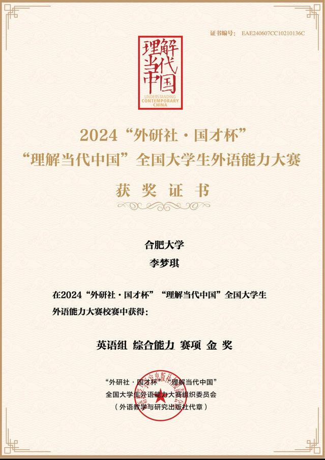 在信息素養競賽中,他以扎實的檢索能力和邏輯思維獲得校賽二等獎;在“外研社·國才杯”英語綜合能力賽項中,他憑借流利的閱讀與出色的寫作能力,榮獲金獎;在全國大學生英語競賽中,他又憑實力獲得C類三等獎,充分展現了其語言與思辨能力的深厚底蘊。