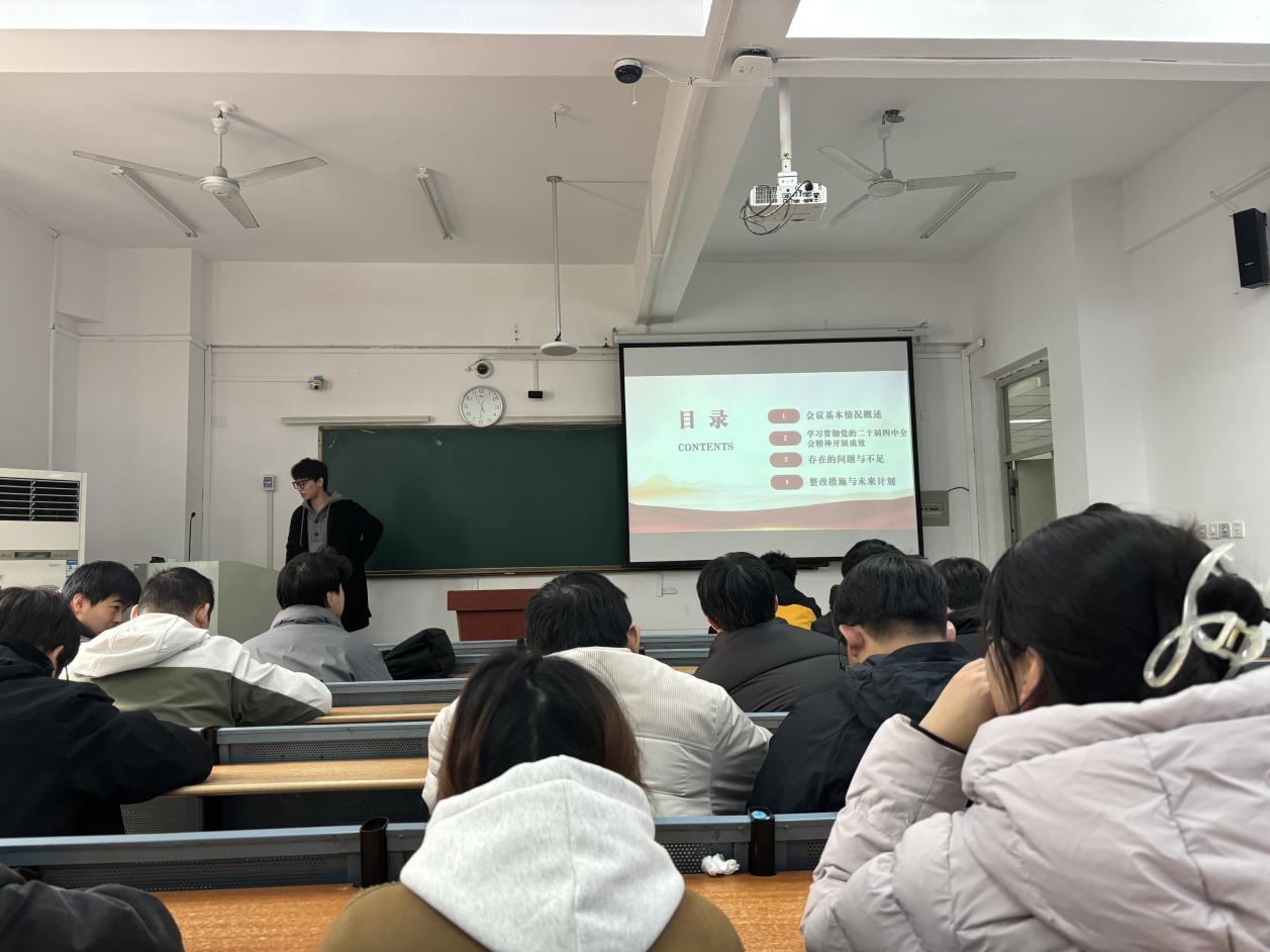 會上,張金輝同學從會議背景、核心任務與支部學習情況等方面進行了詳細介紹,并系統闡釋了全會的重大意義以及“十五五”時期的發展方向和重點舉措。他指出,研究生群體要以多種方式扎實推進全會精神學習教育,將學習成果有效融入科研創新等實際工作中,實現理論學習與實踐工作深度聯動。