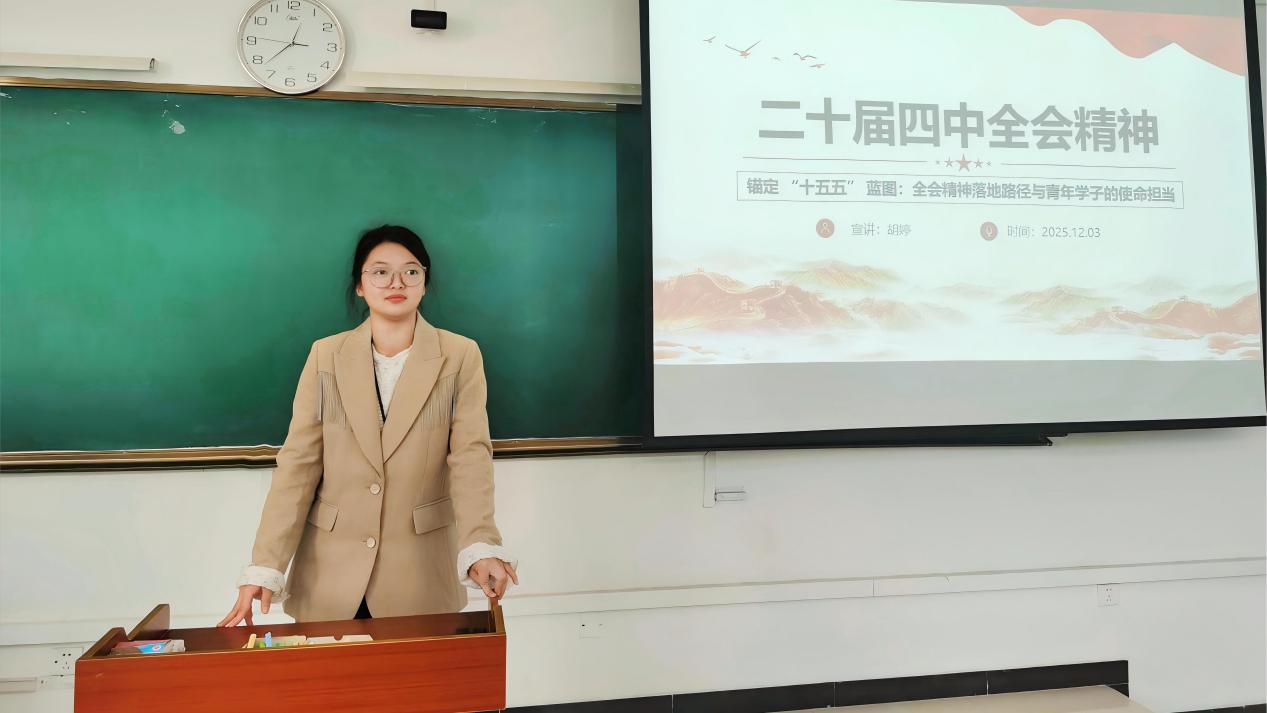 隨后,胡婷同學以“錨定‘十五五’藍圖:全會精神落地路徑與青年學子的使命擔當”為主題,系統宣講闡釋黨的二十屆四中全會精神。她首先介紹黨的二十屆四中全會的基本情況,深入解讀“四中全會”的核心內涵,著重闡明本次全會在“十四五”規劃即將收官、“十五五”規劃即將啟幕的關鍵節點,錨定“十五五”規劃編制與實施核心方向、為基本實現社會主義現代化筑牢基礎的特殊意義。在此基礎上,她全面解讀全會擘畫的未來發展藍圖,針對與青年學子成長發展緊密相關的戰略部署進行重點解讀和深化闡釋,并結合人工智能與大數據領域專業實際,從多個維度清晰指明了青年學子踐行全會精神、勇擔時代使命的具體實踐路徑。