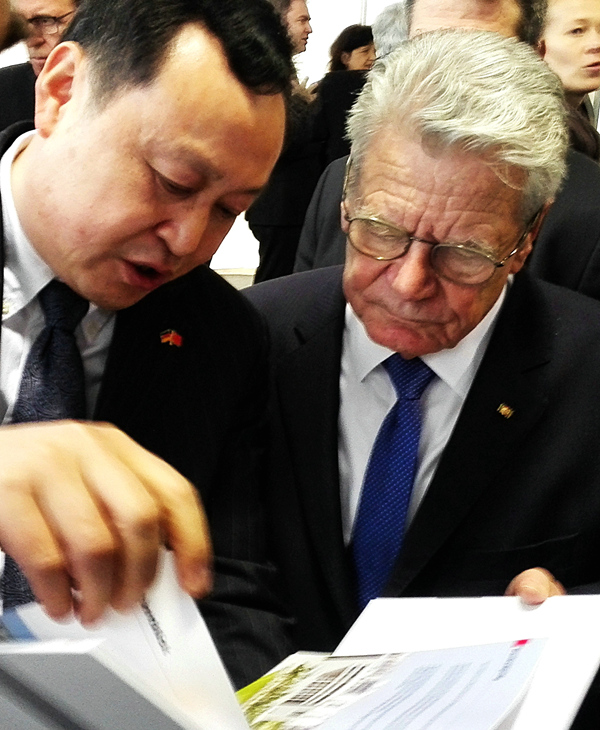 Anschlie?end führte Bundespr?sident Gauck ein Gespr?ch mit Herrn Cai. Dieser beschrieb dem Bundespr?sidenten die 31 j?hrige Zusammenarbeit zwischen der Universit?t Hefei und den deutschen Universit?ten, wie auch den Besuch von Bundeskanzlerin Merkel und Premierminister Li Keqiang. Au?erdem wurde auch der Aufbau der Modelleinrichtung der Bildungskooperation zwischen China und Deutschlandthematisiert. In seiner Reaktion darauf brachte Bundespr?sident Gauck seine Hoffnung zum Ausdruck, dass die Universit?t Hefei auf Dauer mehr Beitr?ge zur Kooperation zwischen chinesischen und deutschen Universit?ten leisten k?nne. Ferner wünschte er dem Aufbau der Modelleinrichtung der Bildungskooperation zwischen China und Deutschland viel Erfolg.