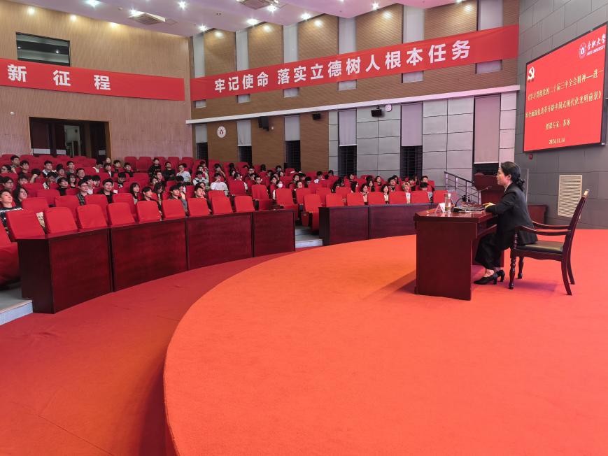 11月14日晚,合肥大學(xué)2024年入黨積極分子培訓(xùn)班理論授課第四講在圖書館報(bào)告廳A舉行,合肥大學(xué)馬克思主義學(xué)院直屬黨支部書記、副院長蘇冰教授擔(dān)任主講,黨課主題為“學(xué)習(xí)貫徹黨的二十屆三中全會(huì)精神——進(jìn)一步全面深化改革開辟中國式現(xiàn)代化光明前景”。先進(jìn)制造工程學(xué)院黨委書記杜娟主持講座,機(jī)制學(xué)生黨支部書記威力旺及全體黨校成員參加講座。