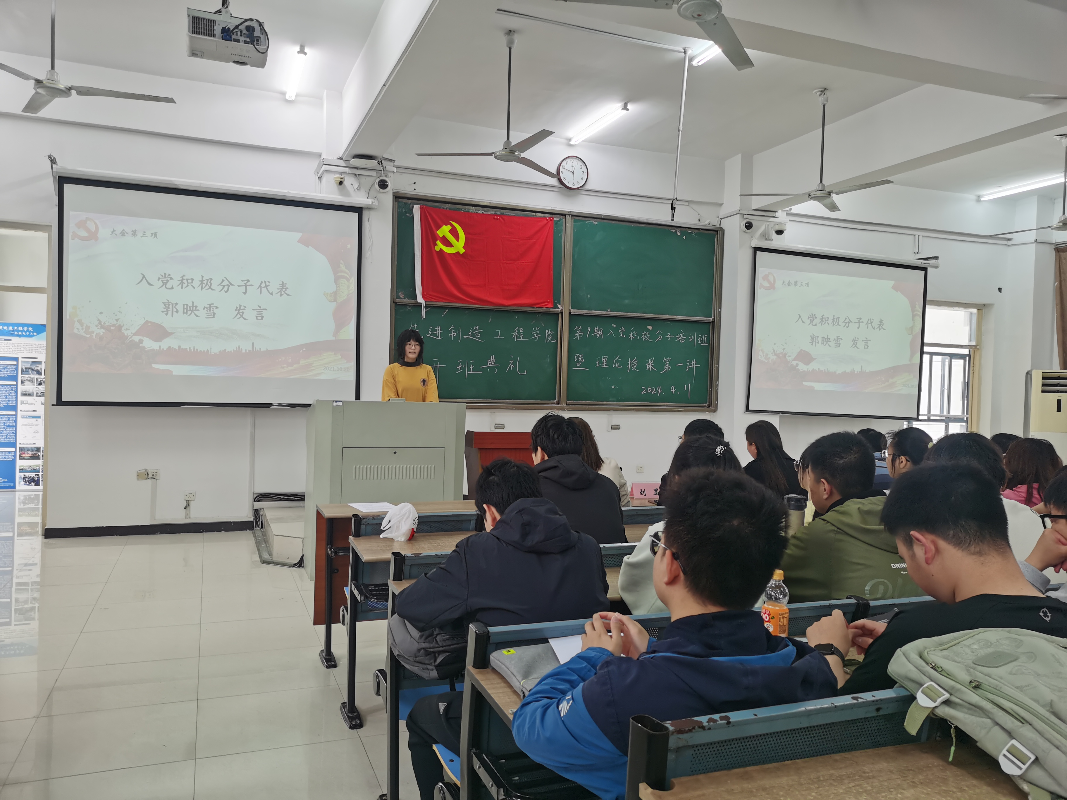 2024年4月11日中午,先進制造工程學院分黨校第九期入黨積極分子培訓班開班典禮在38棟3JT教室舉行。院黨委書記杜娟、學工辦主任劉罡、各學生黨支部書記和109名黨校成員參加開班典禮,典禮由機制學生黨支部書記威力旺老師主持。 首先,全體起立,奏唱國歌。在慷慨激昂、雄渾有力的國歌聲中,本期入黨積極分子培訓班開班典禮拉開了帷幕。