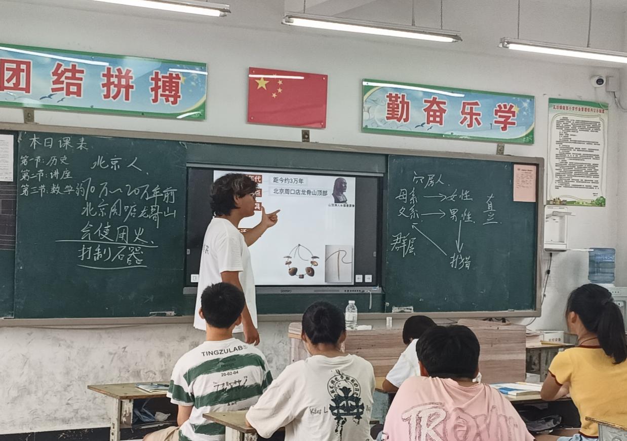 上午,調研團隊在指導老師劉罡與王磊的帶領下,抵達泗縣運河森林公園。在講解員的介紹下,了解到當地紅薯、薄皮核桃等種植作物以及林農間作的種植模式,并對其背后的原理和運作機制進行深入探究。團隊成員充分認識到產業振興對鄉村的重要性,為產業振興鄉村增添新的活力。與此同時,其余成員留校為學生開展知識講座,增加孩子們的受教體驗。余下時間進行作業輔導,解答學習中的疑問。