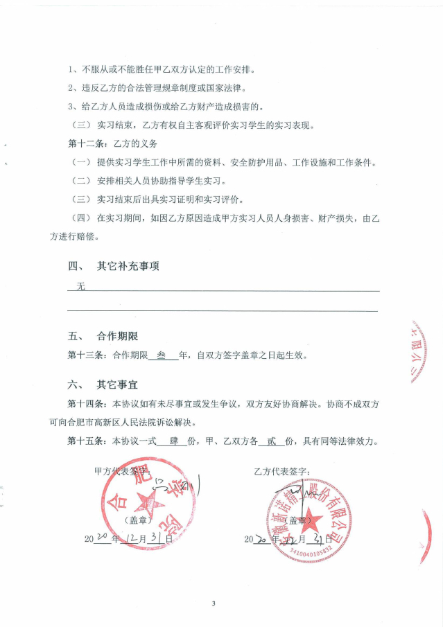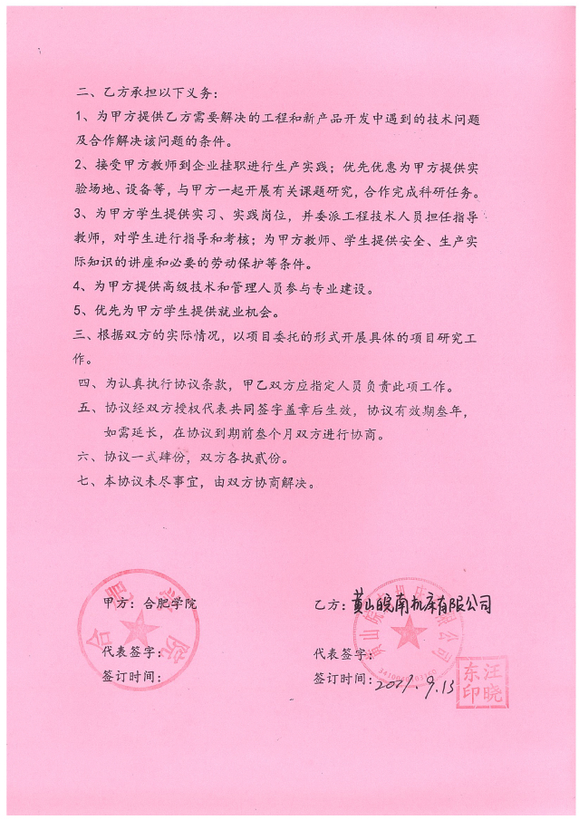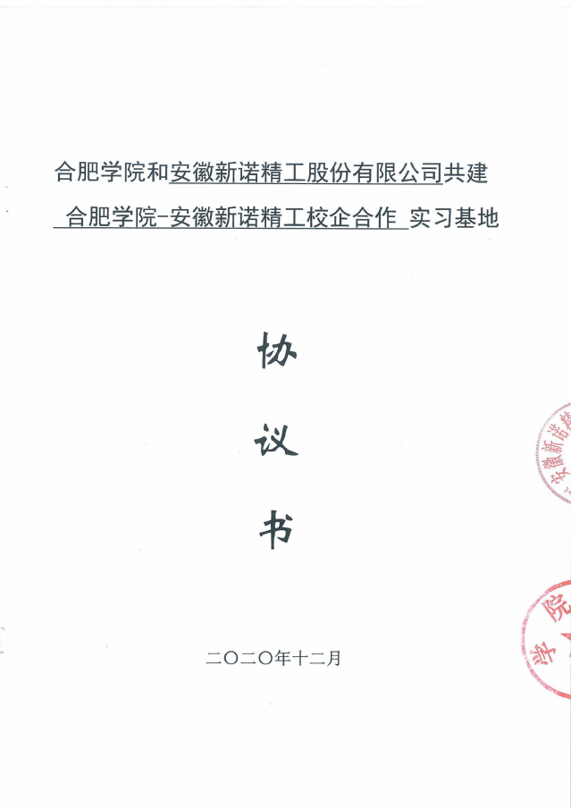 合肥學(xué)院與安徽新諾精工股份有限公司(原黃山皖南機床有限公司)經(jīng)過友好協(xié)商,于2017年9月簽訂了全面合作框架協(xié)議,正式開啟了合肥學(xué)院-安徽新諾精工校企合作實踐教育基地的建設(shè)。2020年2月,雙方又再次簽署了共建實習(xí)基地的協(xié)議書。合作協(xié)議的簽訂,不但明確了校企雙方在合作基地建設(shè)中的權(quán)利和義務(wù),為雙方順利開展各項實踐教學(xué)工作,高質(zhì)量地培養(yǎng)學(xué)生綜合實踐能力和創(chuàng)新能力奠定了基礎(chǔ);同時也為合作基地的健康發(fā)展,以及校企雙方開展全面合作起到了積極的促進作用。