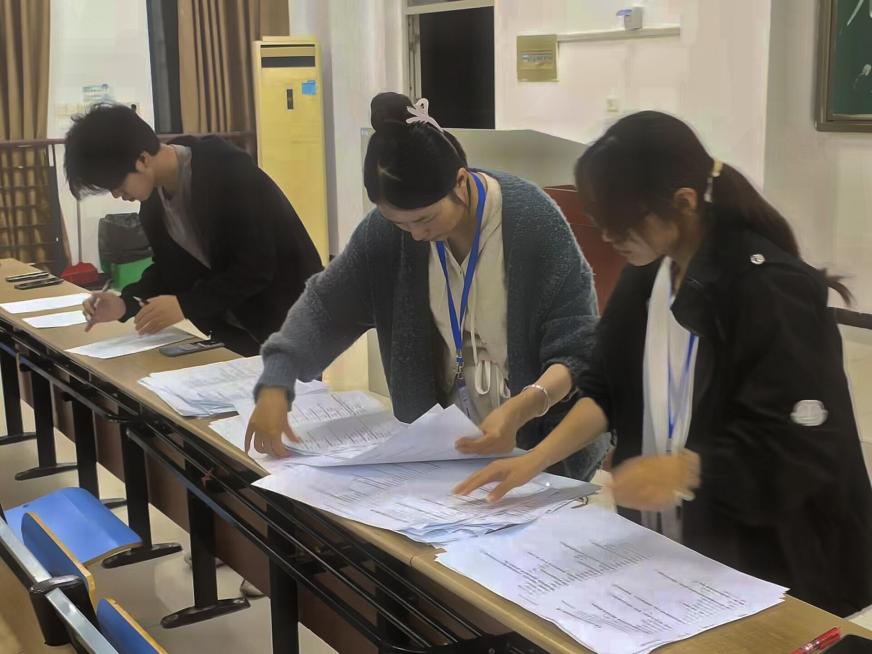 會前,相關工作人員集合,在接受賽前培訓、明確工作分配之后分別前往指定地點布置考場,等待參賽選手進入考場。隨后,參賽選手在工作人員的引導下依次入座,講解考場規則,分發試卷。工作人員各司其職,認真巡視考場,解決突發問題,維護考場秩序,確保比賽公平公正。