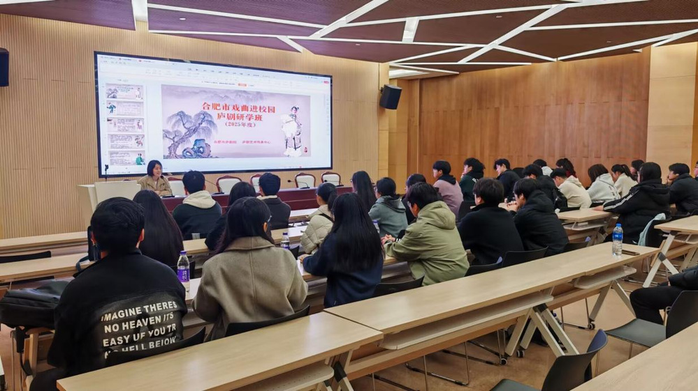 當(dāng)代碼邏輯遇上戲曲韻律,當(dāng)通信波頻邂逅非遺文脈,會碰撞出怎樣的文化火花?12月7日,合肥大學(xué)2025級通信工程專業(yè)30名同學(xué)走進(jìn)合肥市廬劇院,通過“觀、學(xué)、演、悟”四位一體的沉浸式研學(xué)模式,開啟了一場跨越古今的廬劇文化研學(xué)之旅,為工科思維注入了溫潤的人文底色。 溯源:一堂立體的廬劇文化課 上午9時30分,研學(xué)活動在開班儀式與專題講座中拉開序幕。合肥市廬劇院院長、國家一級演員段婷婷老師結(jié)合圖文資料與經(jīng)典片段,系統(tǒng)梳理了廬劇的起源發(fā)展、流派特色、唱腔特點及經(jīng)典劇目,從歷史淵源到文化價值,從經(jīng)典傳承到未來創(chuàng)新,讓同學(xué)們對廬劇的認(rèn)知,從模糊的“地方戲曲”變得立體而鮮活,為后續(xù)的沉浸式體驗筑牢了理論根基。