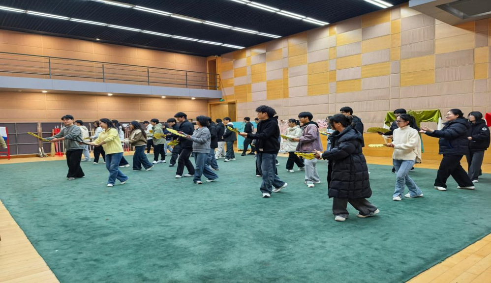 習藝:一次親身的戲曲韻律課 理論的鋪墊在走進排練廳的瞬間轉化為直觀的震撼。旦角戲服上金線繡就的牡丹栩栩如生,凈角靠服的甲片在燈光下泛著沉穩的光澤,同學們小心翼翼地觸摸著不同面料的質感,聽工作人員講解“因角定服、以服塑角”的設計邏輯。“抬手要穩,落步要輕,云手時氣息要跟著動作走”,資深廬劇演員手把手教學基礎身段,臺步的虛實轉換、云手的圓融連貫、蘭花指的細膩柔美,每一個動作都有其章法。一個簡單的蘭花指,指節的角度、手腕的弧度都要恰到好處,這就是傳統藝術的嚴謹。在反復練習與老師的細致糾正中,同學們漸漸找到了肢體韻律的感覺,也真切體會到“臺上一分鐘,臺下十年功”的堅守與不易。