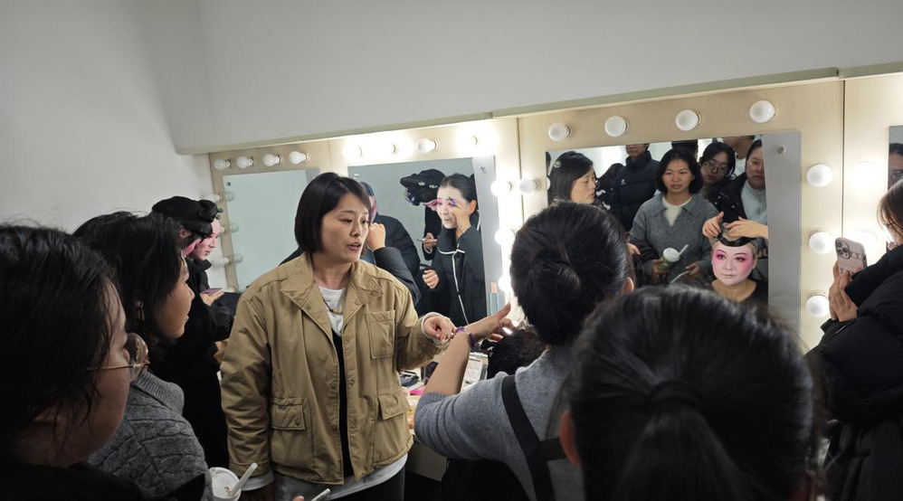 探秘:一場幕后的匠心發現之旅 午后的幕后探秘環節,讓同學們看到了廬劇魅力的“另一面”。在后臺化妝間,演員們正有條不紊地進行上妝造型。“底妝要薄而勻,勾臉的油彩要濃淡相宜,旦角的‘片子’要貼得服帖自然,頭面的插戴更是分毫不能差。這道眼線要比日常化妝粗三倍,才能在舞臺燈光下凸顯眼部神態。”化妝老師一邊演示一邊講解,同學們圍在一旁,認真聆聽著每個步驟的細節。隨后,服裝間里整齊懸掛的數百套戲服、道具庫中精心制作的刀槍劍戟、燈光控制室里復雜的控制臺,都讓大家驚嘆不已。當看到舞臺監督拿著腳本,反復與燈光、音效工作人員確認銜接細節時,同學們深刻認識到,一臺精彩的演出,不僅有臺前演員的光彩,更有幕后團隊的默默奉獻。