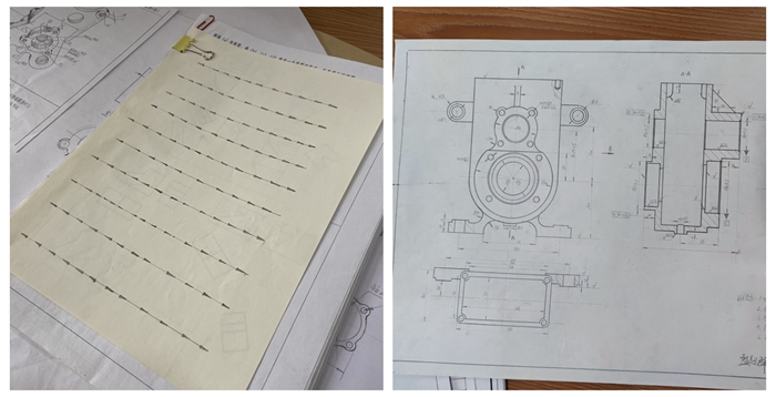 在劉丹萍老師的辦公桌上,疊放著各種尺寸的工科圖紙、日常的課程構(gòu)型集訓題和指導學生參賽的繪圖試卷,小山一樣的材料將她團團圍住,雖然已經(jīng)記不清修改了多少遍,但她對班上每個學生的作圖風格如數(shù)家珍。