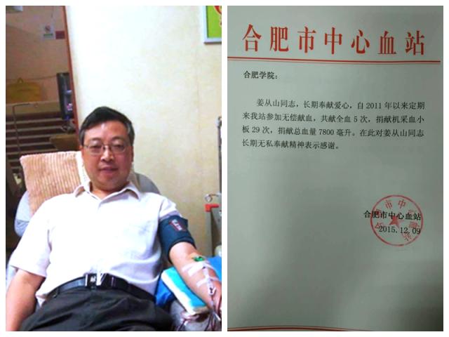 姜從山曾榮獲2014—2015年度“無償獻血貢獻金獎”,該獎是以兩年為限,獻血小板達40個治療量以上,方有資格獲得。目前,姜從山已經是合肥市注冊志愿者,每年至少志愿服務30小時。姜老師還經常利用雙休日赴合肥南站、大學城獻血屋等地進行志愿服務。合肥市中心血站曾經給姜老師寄了一封感謝信,感謝姜老師這些年的無償獻血。
