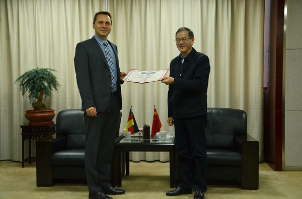 HFU president Prof. Wang Qidong meets him, who briefly introduces HFU’s history, orientation, teaching reform as well as her Sino-German cooperation. Prof. Dr. Evgeny V. Alekseev sings highly of HFU’s school-running pattern and achievements, suggesting to carry out cooperation in the post-graduate training, teacher-student exchange and so on. President Wang Qidong entitles Prof. Dr. Evgeny V. Alekseev “Visiting Professor”, hoping to further the mutual cooperation in related fields as well.