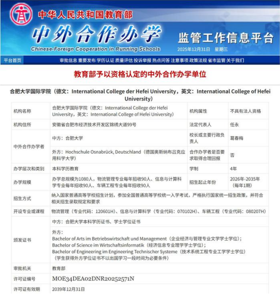 On December 31, the Ministry of Education of the Peoples Republic of China announced the approval results of Chinese-foreign cooperative education institutions and programs. International College of Hefei University, a collaborative initiative between Hefei University (HFU) and Osnabruck University of Applied Sciences(Germany), has been officially approved for establishment, which is the second Chinese-foreign cooperative education institution in Anhui Province. This is a significant milestone for HFU to serve the national strategy of education opening-up and meet the talent demands of Anhuis new energy vehicle industry chain, as well as a landmark in HFUs journey of internationalized education.