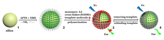 In this paper, it is mentioned that the synthesized SiO2@MIPs forms a microsensor array on the regular dot array of etched silicon wafers by self-assembled technique, and four heavy metal ions, whose LOD concentration is 10?9 mol·L?1, enter the nanostructured shell-layer with fluorescence-tagged recognition site driven by concentration differences. The recognition sites have highly selective recognition of heavy metal ions with sensitive responses. Based on FRET principle, ultra-trace detection of the target analytes can be achieved, which solves the problem of identification and detection of polymetallic ions.