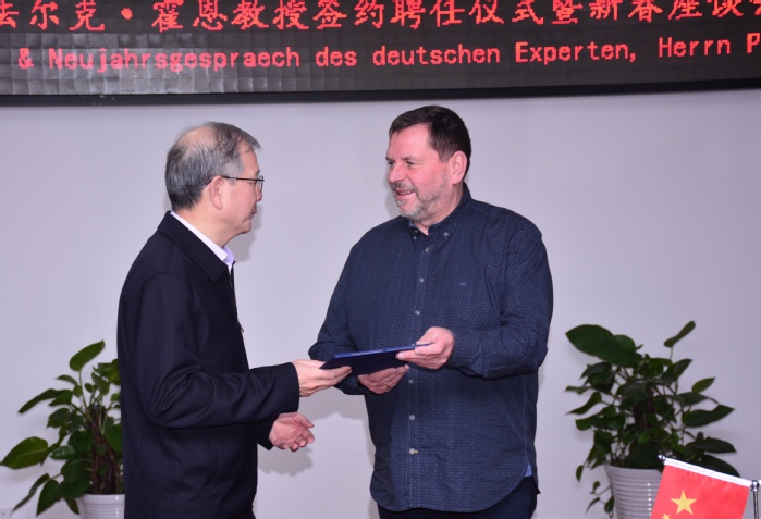 2月10日上午,我校在行政樓九樓東會議室舉辦外籍教授聘任儀式暨新春座談會,來自德國漢諾威應用科學大學的法爾克·霍恩受聘為學校外籍教授。黨委書記王其東、院長吳春梅出席儀式,組織部、教務處、人事處、國際交流合作處、研究生處、設計學院、外國語學院等相關單位負責人參加儀式。王其東給霍恩教授頒發聘書,人事處處長紀平代表學校與霍恩教授簽訂聘任協議。