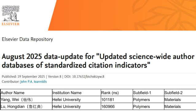 近日,斯坦福大學(xué)與國(guó)際權(quán)威學(xué)術(shù)出版社愛(ài)思唯爾聯(lián)合發(fā)布2025年全球前2%頂尖科學(xué)家榜單。我院楊偉教授和魯紅典教授入選2025年全球前2%頂尖科學(xué)家“年度影響力”榜單。這是繼2023年以來(lái),兩位教授連續(xù)第三年入選該榜單。此外,楊偉教授和魯紅典教授于2024年分別牽頭獲得安徽省自然科學(xué)二等獎(jiǎng)和中國(guó)非金屬礦科學(xué)技術(shù)二等獎(jiǎng)(基礎(chǔ)研究類),這充分體現(xiàn)出學(xué)院在高層次人才培養(yǎng)方面取得了長(zhǎng)足進(jìn)步。
