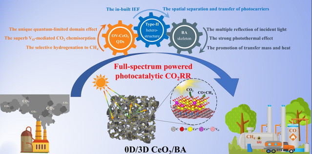 太陽能驅動的光催化能源生成技術為開發(fā)可持續(xù)清潔能源資源以及實現(xiàn)碳中和提供了極具前景的途徑。近日,我院鄧崇海教授課題組在針對溫室氣體二氧化碳資源化轉化為高附加值合成氣(甲烷)方面取得重要研究進展,相關研究成果發(fā)表于工程材料類國際權威期刊《Chemical Engineering Journal》(中科院一區(qū)TOP,影響因子13.2),題為《Interfacial engineering of 0D/3D CeO2/BA nanoarchitectures for highly efficient and selective CO2 photo-reduction to CH4 based on full-spectrum solar-energy utilization》。