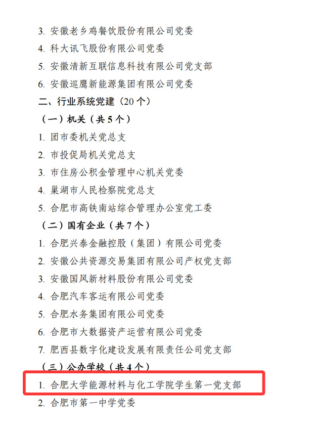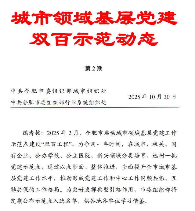 2025年第一季度,合肥市啟動城市領域基層黨建工作示范點建設“雙百工程”,力爭用一年時間分類培育、選樹一批黨建示范點,通過以點帶面、整體推進,全面提升全市城市基層黨建工作水平。經學校黨委推薦,能源材料與化工學院第一黨支部入選市委組織部城市領域基層黨建雙百示范點(第二批),是全市公辦高校唯一入選黨支部。