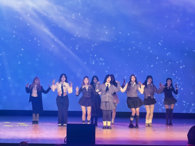 相較于第一幕的溫婉抒情,晚會第二幕的旋律與節奏更富層次,以多元表演點燃全場熱情。姜思萌、王鈺慶、陳湞極、高雅雯等表演者帶來的模特走秀率先登場,瞬間引爆氣氛。表演者們身著金屬質感亮片服飾,手持創意道具,在“藍色科技感幾何圖案”的舞臺背景下踏出颯爽臺步,利落的身姿與富有設計感的造型相得益彰,每一次轉身、每一個定格都引來臺下陣陣歡呼,現場熱度瞬間拉滿。走秀結束后,金涵以一首《落》為全場降溫,卻讓情感更顯綿長。她立于綴滿粉色繁花的中式窗欞圖案大屏前,婉轉的歌聲搭配雅致的舞臺畫面,將 “落花無言,人淡如菊”的意境緩緩鋪陳,余韻悠長,讓觀眾沉醉其中。隨后,李蕤老師帶來獨舞《絨花》,以優美的肢體語言詮釋歌曲的柔情與深意——抬手似花瓣輕顫,轉身如流云漫卷,每一個動作都牽動著觀眾的心弦;緊接著,孫若茜身著金色流光長裙登臺,以《我只在乎你》傳遞細膩情感,溫柔的歌聲如細流般淌入觀眾心田,不少師生隨之輕哼,現場溫情涌動。隨后,鄭鳴揚、張奧雪等演員帶來的小品《萬松書院》。舞臺背景還原了古雅的書院場景,演員們身著古裝演繹“反串版梁祝”:畢業之際的互訴衷腸、祝英臺揭曉女兒身的波折、眾人因香囊手帕引發的“爭認女孩”詼諧情節,再加上先生“看破不說破”的通透、馬文才“成人之美”的溫情設定,既笑點密集又不失暖意,現場笑聲與掌聲此起彼伏。