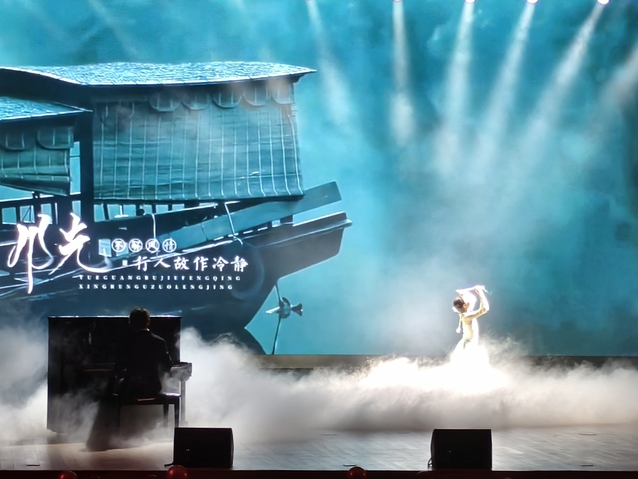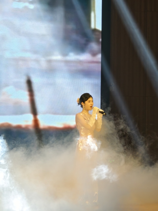 伴隨著輕柔的音樂,晚會第一幕緩緩拉開帷幕。首先登場的是張夢珊、肖一遙帶來的舞蹈與鋼琴合奏《夜泊秦淮》。舞者身著典雅淺色長裙,在“帆影凌波”的舞臺背景中翩躚,舞臺輕煙裊裊,悠揚的鋼琴旋律與靈動的舞姿相融相生,將秦淮夜色的溫婉意境娓娓道來,讓觀眾仿佛置身江南水鄉。隨后,胡詩琪懷抱木吉他登臺,以一首《betty》點亮全場。她靜坐舞臺中央,背后大屏鋪展著“紅葉滿街”的暖色調畫面,溫柔的嗓音如清風拂過會場,治愈感漫溢。緊接著,鄭妍、葉昌棟帶來男女對唱《愛錯》。二人分別身著黑色亮片長裙與深色西裝,在星光光束與舞臺煙霧的交織中深情演繹,大屏上的歌詞字幕隨旋律輕躍,情感飽滿的歌聲直抵人心,將愛情里的遺憾與悵惘詮釋得淋漓盡致。第一幕的壓軸節目是張奧雪、王雨晨等演員帶來的話劇《雷雨》節選。演員們身著貼合角色的服飾,在還原故事氛圍的舞臺背景下,精準把握人物情緒,將周樸園的虛偽、繁漪的掙扎、侍萍的隱忍展現得入木三分,緊湊的劇情節奏讓觀眾沉浸式走入經典。