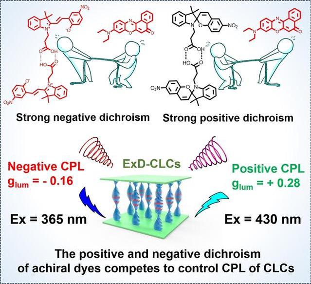 手性發(fā)光液晶(CLCs)通過超分子自組裝能夠形成宏觀的螺旋超結(jié)構(gòu)從而表現(xiàn)出高的發(fā)光不對稱因子(glum),受到科研工作者越來越多的關(guān)注。然而,構(gòu)建易于制備和CPL信號快速響應(yīng)的光可調(diào)控CLCs系統(tǒng)仍然是一個具有挑戰(zhàn)的難題。研究發(fā)現(xiàn),基于光敏螺吡喃骨架制備的SP-COOH分子在液晶介質(zhì)中由于形成了分子間羧酸二聚體而呈現(xiàn)出負(fù)二向性。液晶主體中的SP-COOH分子在紫外光照射前后表現(xiàn)出從“無”到“有”的負(fù)二向性發(fā)光。繼續(xù)向液晶主體摻雜適量具有正二向性的尼羅紅染料(NR),可以輕易制備具有激發(fā)依賴特性的手性液晶ExD-CLCs。利用其依賴于激發(fā)的圓偏振發(fā)光信號反轉(zhuǎn)特性,能夠?qū)崿F(xiàn)基于ExD-CLCs的四重信息防偽加密。該項(xiàng)工作為利用超分子自組裝構(gòu)筑高效圓偏振發(fā)光材料、揭示多層次手性傳遞、放大與反轉(zhuǎn)規(guī)律以及制備刺激響應(yīng)性手性發(fā)光材料提供了理論基礎(chǔ)。(論文鏈接:doi.org/10.1002/anie.202420290)