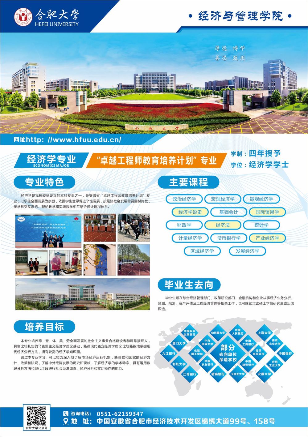 經濟學(本科) 咨詢電話:0551-62159347 省級“卓越經濟工程師教育培養計劃”專業 學制:四年 授予學位:經濟學學士 培養目標及特色:本專業培養德、智、體、美、勞全面發展,具備馬克思主義經濟學理論基礎,熟悉現代西方經濟學理論,熟練掌握現代經濟分析方法,知識面較寬,具有向經濟學相關領域擴展滲透能力的專業類人才;同時,根據我校地方性、應用型、國際化的辦學定位,注重對學生進行理論教學與實踐鍛煉同步結合,使學生具有國際宏觀視野,并熟悉國內外經濟現狀,能夠理論聯系實際,同時具備較強適應性能力的高層次應用型人才。本專業注重培養理論基礎扎實、邏輯思維清晰、實踐能力較強的復合型人才。 畢業生發展方向:畢業生可在政府部門、政策研究部門、金融部門和相關企業從事經濟分析、預測、規劃和經濟管理等相關工作;也可繼續攻讀碩士學位研究生或出國深造。