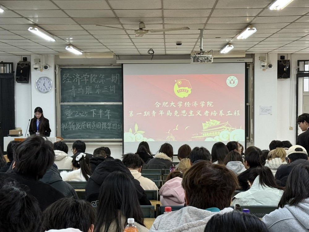 2025年11月28日中午,經濟學院第一期青年馬克思主義者培養工程(簡稱“青馬班”)第三講在一期4棟107教室順利開講。本次課程以“學習二十屆四中全會精神,爭做新時代有為青年”為主題,由學院學生會執行主席歐林倩主講,青馬班全體學員齊聚課堂,以理論學習深化思想淬煉,筑牢青春信仰根基。