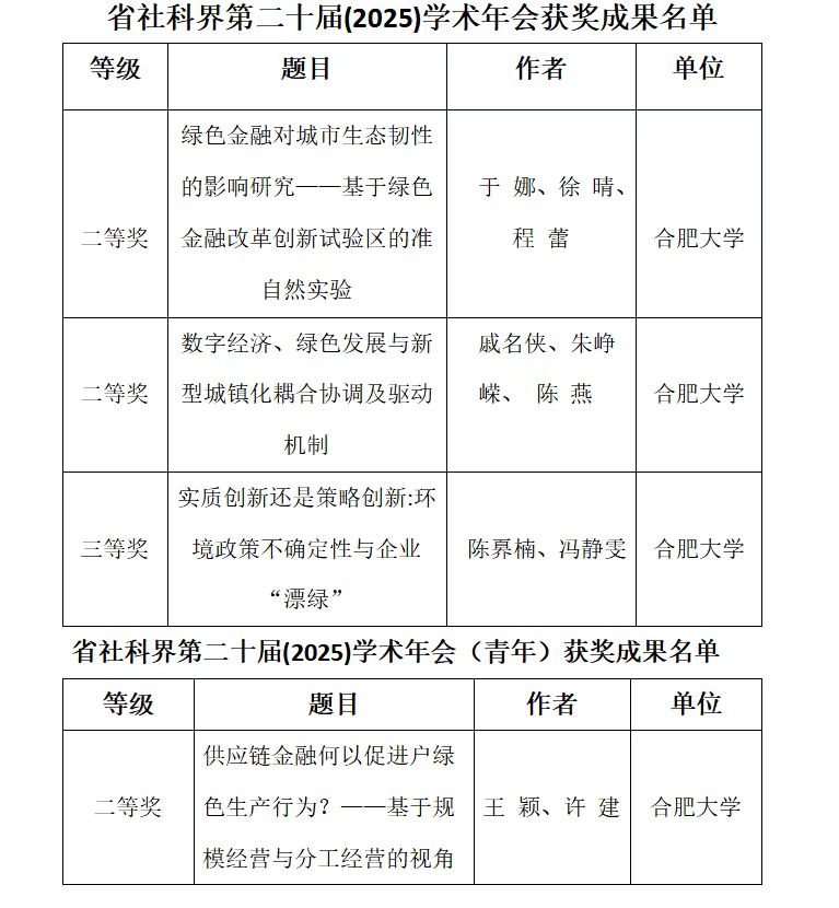 近日,安徽省社科界第二十屆(2025)學術年會擬獲獎成果名單正式揭曉。我院師生表現突出,共有多項成果入選,其中,在一般獎項中,獲二等獎2項、三等獎1項,在青年獎項中,獲二等獎1項,展現了學校在哲學社會科學研究領域的扎實積累與創新活力。