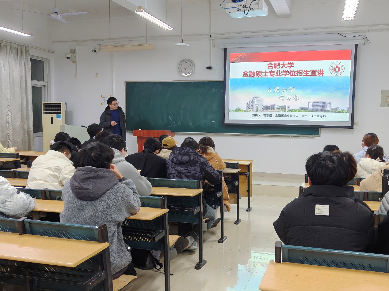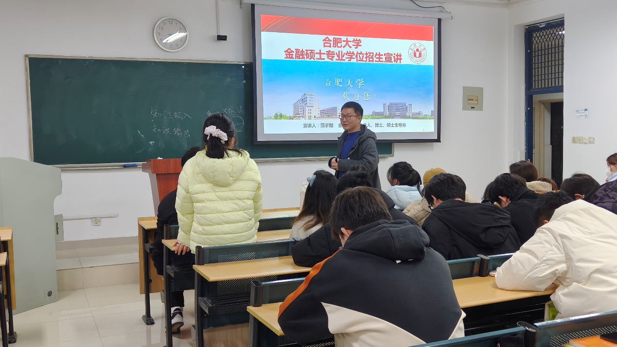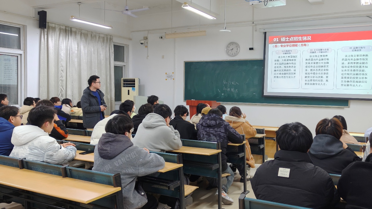 2025年12月18日晚18:30,合肥大學經濟學院2026年碩士研究生招生宣傳講座在一期4棟105教室成功舉辦。經濟學院100余名大三學生前來參加了講座學習,講座由金融碩士點負責人范宇翔老師進行講解。