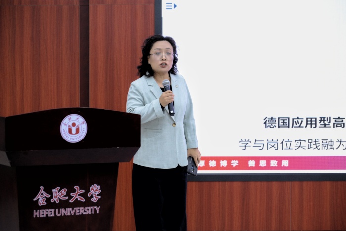 教務(wù)處處長(zhǎng)葛春梅教授以“中德應(yīng)用型高等教育的發(fā)展和比較研究”為題,系統(tǒng)介紹了我校在中德合作背景下開(kāi)展應(yīng)用型高等教育改革的探索與實(shí)踐,分享了我校在學(xué)科建設(shè)、研究生教育、中外合作辦學(xué)機(jī)構(gòu)建設(shè)等方面的成果,展現(xiàn)了學(xué)校堅(jiān)持開(kāi)放辦學(xué)、深化產(chǎn)教融合的持續(xù)努力。