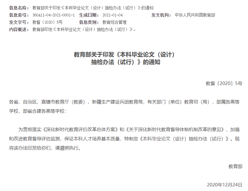 第七條 教育部建立全國本科畢業論文抽檢信息平臺(以下簡稱抽檢信息平臺),面向省級教育行政部門提供學術不端行為檢測、畢業論文提取和專家評審等定制功能,對各省級教育行政部門開展本科畢業論文抽檢工作實行全過程監督。