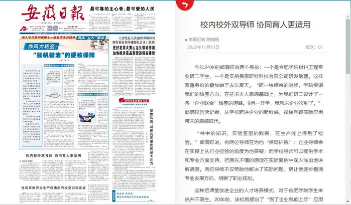 “書(shū)中的知識(shí)、實(shí)驗(yàn)室里的數(shù)據(jù),在生產(chǎn)線上得到了檢驗(yàn)。”郎滿權(quán)說(shuō),有兩位導(dǎo)師在為他“保駕護(hù)航”:企業(yè)導(dǎo)師會(huì)在實(shí)操上從行業(yè)經(jīng)驗(yàn)的角度為他答疑;而學(xué)校導(dǎo)師可以提供學(xué)術(shù)和專業(yè)方面支持,把原先不懂的原理在實(shí)際案例中深入淺出地講解清楚。兩位導(dǎo)師不僅幫助他解決了實(shí)際問(wèn)題,更讓他逐步看清專業(yè)發(fā)展方向,明晰了職業(yè)規(guī)劃。