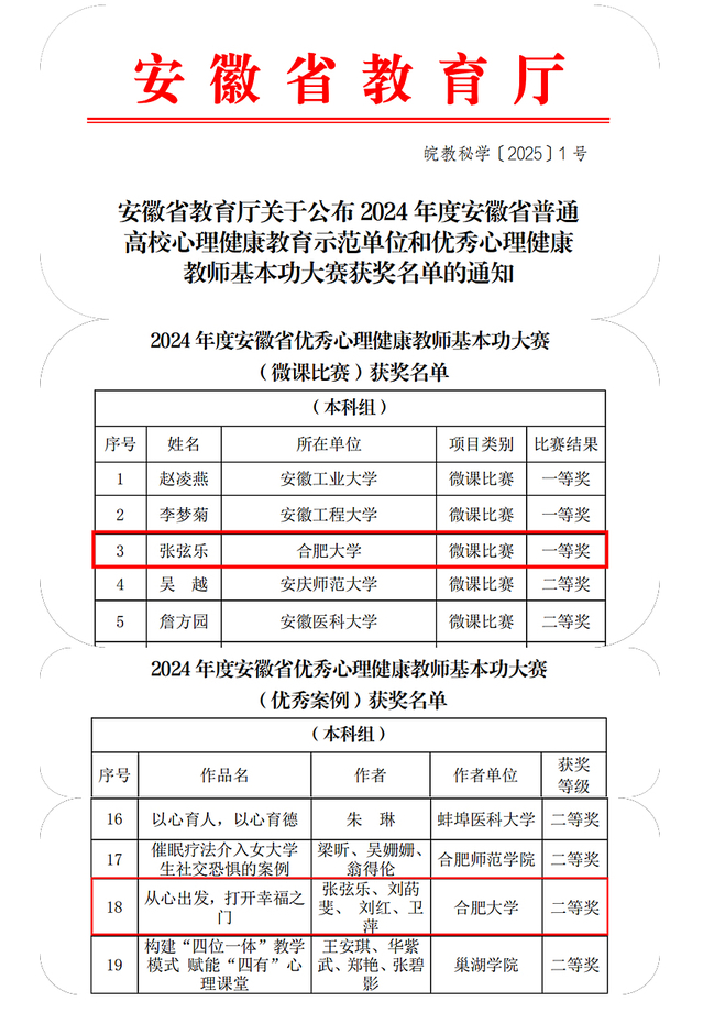 近日,從省教育廳傳來消息,我院教師張弦樂在2024 年度安徽省普通高校優秀心理健康教師基本功大賽中榮獲本科組微課比賽一等獎、優秀案例競賽本科組二等獎。