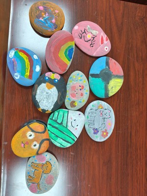 團隊成員們將石頭、畫筆、丙烯顏料等工具分發給孩子們,帶領孩子們對每一塊石頭進行創意繪畫。在老師的指導下,孩子們對石頭進行分類、清洗、創作,展現出各種圖案的石頭:有的像熊貓,有的像小狗……在丙烯顏料的幫助和師生共同的努力下,將原本單調的石頭裝飾地美輪美奐。 課程尾聲,魯丹妮組織孩子們進行作品展示,介紹自己作品的創意特點和使用的創作手法,看著孩子們手上高高舉起的石頭畫作品,不斷對孩子們的創意和努力給予肯定。