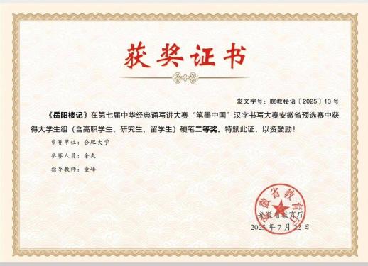 與此同時,在2025年第七屆中華經典誦寫講大賽安徽省“筆墨中國”漢字書寫大賽硬筆類比賽中,由美育中心童峰老師指導的23級小學教育專業王紫悅、余爽兩位同學雙雙榮獲二等獎,展現了我院學子扎實的漢字書寫功底和良好的傳統文化素養。