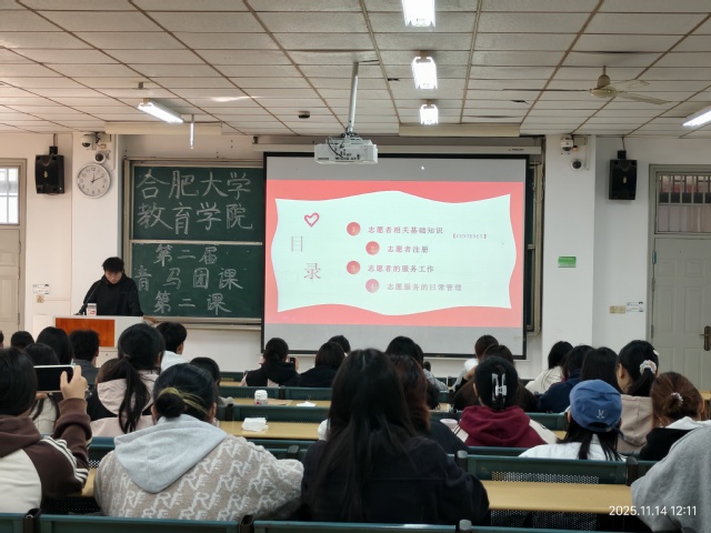 為提升青年馬克思主義者培養(yǎng)工程學(xué)員的實(shí)踐能力與宣傳素養(yǎng),11月14日12點(diǎn)10分,合肥大學(xué)教育學(xué)院第二屆青馬團(tuán)課第二課在一期3棟101教室順利開(kāi)展。本次課程以“志愿服務(wù)講解及新聞稿撰寫(xiě)”為核心主題,由汪世穎主持,社會(huì)實(shí)踐與志愿服務(wù)中心部長(zhǎng)李好、記者團(tuán)團(tuán)長(zhǎng)黃夢(mèng)蝶分別擔(dān)任主講人。